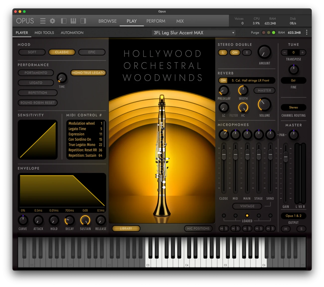 Powerful control features include Master key-switches where all articulations can be fully customized in the OPUS articulation palette. You can also customize the sound of each instrument using the new MOODS feature. Classic Mood is the original Hollywood Orchestra sound. Soft Mood modifies the sound for slower, more emotional passages. Epic Mood does the opposite, giving you a sound perfectly suited for your next Action Adventure score. Each mood changes the settings and the look of the interface, which has been completely redesigned and stylized for Hollywood Strings, Hollywood Brass, Hollywood Orchestral Woodwinds, Hollywood Percussion, Hollywood Solo Violin, Hollywood Solo Cello, and Hollywood Harp.